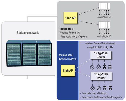 圖1顯示未來智慧家庭感測器網路的範例。在此情境中,室內安裝一個採用802.11ah技術的AP。整個住家到處都部署溫度感應器、光線感應器及智慧型電表等各種不同裝置,讓家用裝置及家電用品變得更聰明。