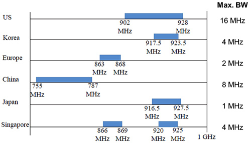 美國分配到902M∼928MHz的頻率範圍,最大頻寬是16MHz;中國配置的總頻寬是32MHz,頻率範圍為755M∼787MHz,最大頻寬是8MHz;韓國針對802.11ah通道配置917.5M∼923.5MHz的頻率範圍,最大頻寬是4MHz;日本有十一個1MHz通道,頻率範圍為916.5M∼927.5MHz;新加坡頻率範圍分成兩段,分別是866M∼869MHz及920M∼925MHz,總共是8MHz,最大頻寬是4MHz。