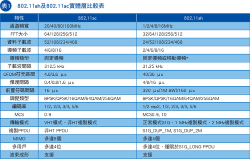 如為S1G_DUP_1MHz模式,其所有占用頻寬都會重複S1G 1MHz,因此就4MHz頻寬而言,會重複所有四個1MHz通道的S1G 1MHz訊號。802.11ah也支援多用戶多輸入多輸出(MU-MIMO),但僅限4×MIMO串流。802.11ac的波束成形也是支援項目之一。表1逐項顯示802.11ac與802.11ah的對照關係。