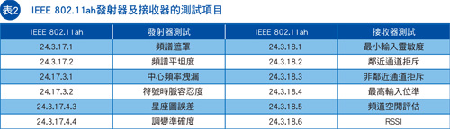 802.11ah草案標準中定義發射器及接收器的測試項目(表2)。這些項目與其他WLAN標準類似,但每個封包會根據頻寬及時序進行縮減。例如,接收器最低輸入位準靈敏度測試需降低10dB,因相較於802.11ac標準,802.11ah只需要十分之一的頻寬。