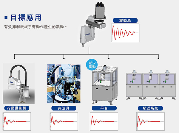 以機器視覺為例,如果工業相機是安裝在機械手臂上,則主動式抑振技術可明顯縮短相機的晃動時間,提高影像的品質。但如果工業相機是安裝在手臂以外的某個定點,例如用工業相機做二次定位的手機面板精密組裝,主動抑振同樣可以發揮效益,因為手臂把工件帶到到相機鏡頭前的時候,工件的晃動可以更快停止,甚至幾乎不用等待時間,相機也能取得清晰的影像。