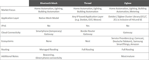 另外,越來越多家用裝置具備聯網能力,也將使多對多架構的網狀網路(Mesh Network),取代過去以網路閘道器為中心,一對多架構的星狀網路。寶陸格表示,網狀網路相較星狀網路有連結距離較長、耗電量較低、網路規模較大、系統穩定性更佳,並提供更好的回應能力(Deliver Optimal Responsiveness)等優勢。目前Bluetooth Mesh、Thread、Zigbee都可以提供網狀網路功能(圖4),技術各有優劣勢,智慧家庭平台業者亦會針對自身的需求導入相關服務。