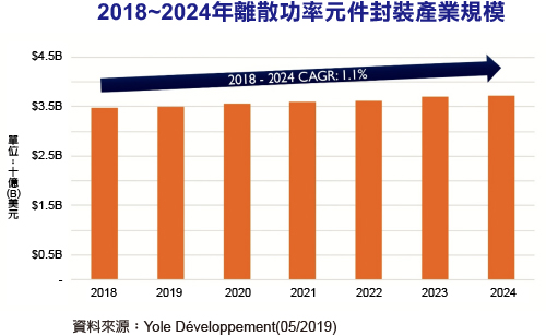 產業研究機構Yole Développement(Yole)最新研究報告顯示,2018年離散功率元件市場規模接近135億美元,從2018年到2024年的年均複合成長率為2.9%。離散功率元件市場的發展也緊跟全球功率 電子產業的成長趨勢。離散功率元件產業的特性和需求包括單一元件成本低、產品和供應商 選擇範圍廣,以及使用經過驗證的高度標準化產品和技術。