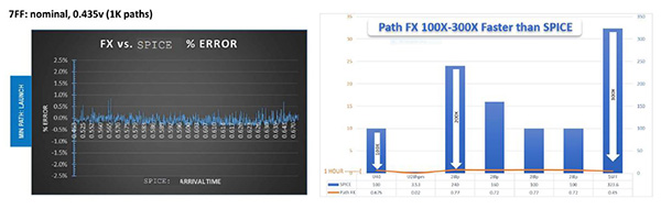 圖3顯示Path FX可預期的準確水平,這個散布圖比較Path FX和SPICE結果。右邊的圖顯示此SPICE效能改善的程度,它和SPICE相同,但是全自動化的;其作為一種普通時序工具,因此工程團隊不需考量SPICE的類比屬性。