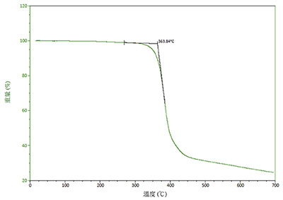 組合物PCT 1的梯度熱重量分析(TGA)掃描圖,如圖1所示。該材料顯示出優異的穩定性,直到超過360℃才發生重量損失。組合物PCT 2表現相似,展現出348℃的瞬間分解溫度。