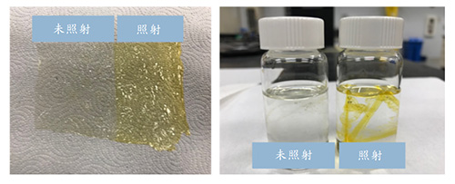 由於聚合物結構內的光誘發交聯,曝露於中UV下會大幅改變新PCT材料的溶解度和熔融流動性質。圖3a顯示用650瓦實驗室UV燈照射5分鐘之前和之後,組合物PCT 2薄膜樣品的圖像。UV照射引起明顯的薄膜顏色變化。但於此同時,其變得完全不受二甲基亞(DMSO)(一種強力聚合物溶劑)的侵蝕,而未固化(未照射)薄膜的樣品在置於相同溶劑中後不到1分鐘內溶解。在圖3b中的兩個樣品小瓶圖像可清楚地辨別溶解度的根本變化。後續研究顯示,只需30秒的UV燈照射,即可觀察到類似的溶解度變化。
