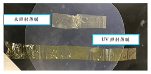 光固化亦大幅改變了PCT材料的熱軟化性能。圖4中的圖像顯示以100℃加熱30分鐘後,第三種組合物PCT 3照射和未照射膜帶的行為。組合物PCT 3具有接近室溫的Tg,且具有非常高的彈性和伸長率,是柔軟的材料。當一條膜帶曝露在實驗室UV燈下幾分鐘後,將其折疊使膜帶末端與膜帶的中心部分接觸後再加熱時,接觸的區域不會流動且會黏合在一起,因其為透過曝光過程交聯。另一方面,未曝光膜帶的接觸區域容易流動並黏合在一起,基本上變成固體狀態。