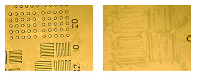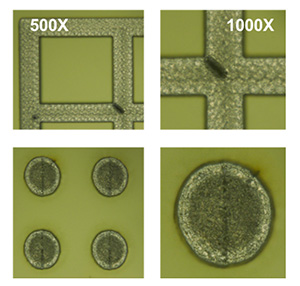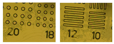 PCT材料在光譜上中紫外光段的強吸光度,使其對通常在308~355奈米(nm)波長下工作的脈衝雷射蝕刻系統非常敏感。藉由使用以355奈米操作的定製皮秒脈衝雷射系統,利用雷射光技術(Herman, MO),在矽晶片上塗覆一層10~15微米厚的PCT 1近似變異體的焊盤(200微米×200微米)及通孔(100微米直徑)特徵圖案。其他相關的雷射操作參數如下:雷射脈衝能量-0.33μJ/脈衝、平均雷射功率-0.825毫瓦(mW)、峰值雷射功率-22千瓦(kW)、脈衝長度-<15ps、雷射重複率-2500Hz。
