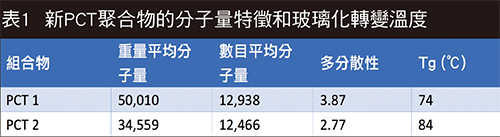 針對新PCT材料的整體設計目標,包含:高聚合物分子量具有適度的後固化交聯密度,以保持良好的機械強度、可撓性和韌性;本身具有光敏性,無需光酸產生劑、光引發劑、增效劑、交聯劑等添加劑;使用適合晶圓廠的溶劑成分,進行塗覆和澆膜;對半導體材料和其他塑膠有很強的黏著力;在光固化之前,能夠在200℃以下進行熱成型(模塑、壓印、擠出等);在300℃以上時保持熱穩定性;高脈衝UV雷射敏感度,便於快速、乾淨的雷射鑽孔。