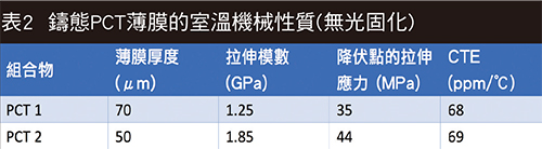 處於預固化狀態的PCT聚合物是真正的熱塑性塑膠,且具有良好的可撓性和強度。表2所示的組合物PCT 1和PCT 2薄膜的機械性質資料,顯示其在室溫下為玻璃狀且中等硬度的材料。但其具有撓性,且可以反覆彎曲而不會破斷(其所示為在降伏點而非破斷點時的拉伸應力值,推測在破斷點時的拉伸應力即抗拉強度會更高)。分別藉由動態機械分析(DMA)和熱機械分析(TMA)決定機械性質和熱膨脹係數(CTE)。