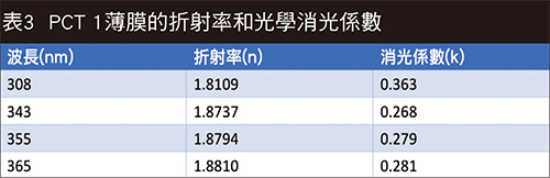 新的PCT材料設計上本身即有對中度UV的感光性。亦即光固化涉及功能部位(Functional Moieties)在聚合物結構內的直接反應,且不須要添加任何類型的光引發劑或增效劑,例如自由基固化的丙烯酸樹脂或陽離子固化的環氧塗料。這些相同的功能部位具有非常強的UV吸收力,表3所示組合物PCT 1中度UV波長的高光學消光係數(k)即為明證(k值為0.1的材料通常即視為具有高吸收力)。透過塗覆在矽晶片上聚合物薄膜的可變角度掃描橢圓偏光術,測定表3中的折射率和消光係數值。