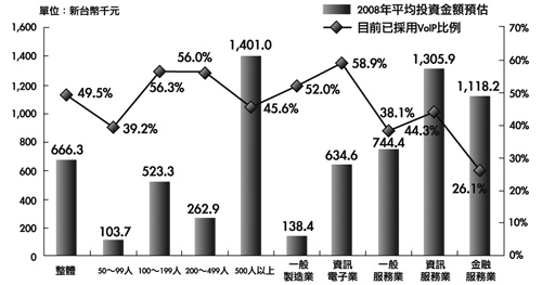 為因應多點、分散的營運環境及達到縮減成本的目的,VoIP成為企業內部通訊整合的重要平台,而多方通訊是企業最重視的功能。2008年台灣企業VoIP投資規模中以金融服務業及資訊服務業的投資意願最為積極(圖2),並有5%以上的企業表示未來將持續增加VoIP的投資,尤以五百人以上的公司投資意願更高。張家維表示,台灣企業較偏好採用以軟體如Skype搭配硬體產品,或是透過板卡與現有交換器整合方式的VoIP,其中以軟體搭配硬體產品的比例約占四成,除多方通話外,同時也重視視訊會議功能,以節省營運成本,而企業最擔心VoIP語音品質不穩定、網路中斷及頻寬不足等問題,也是VoIP發展以來,相關廠商持續努力的目標。