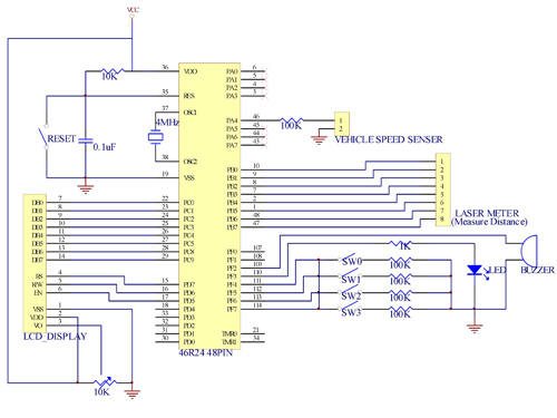 圖2為行車安全間距警示系統的系統電路架構圖。本系統所使用的微控制器為HT46R24作為計算核心單元。其中Port C及Port D控制液晶顯示器模組(Liquid Crystal Display Modules)顯示資訊,包括與前車距離,安全間距,和其他的行車條件與設定資訊等。PA4用以接收車輛的車速脈波。以Port B控制及讀取與前車的間距資料阜。Port F則用來驅動蜂鳴器、LED及輸入資料設定鈕,使用者可由按鈕開關輸入其他的行車條件與設定資訊等,LED及蜂鳴器主要在車輛沒有保持安全間距時,以燈光警示及聲音警示提醒駕駛者須保持安全間距以確保行車安全。