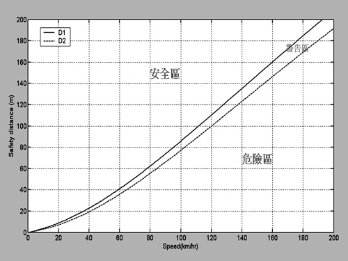 圖5為車輛行車安全距離與車速的關係曲線圖,其中有包括由表1中的模擬條件下,模擬出來的煞車制動距離(Db)加上反應滑動時間t1所對應的反應滑動距離(Dt1),所產生的行車安全間距D1;以及由表1中的模擬條件下,模擬出來的煞車制動距離(Db)加上反應滑動時間t2所對應的反應滑動距離(Dt2),所產生的行車安全間距D2。如果行車安全間距比D1還要大的時候,就表示行車的狀況在安全區,如果行車安全間距比D2還要小的時候,就表示行車的狀況在危險區,如果在D1與D2之間,就表示行車狀況在本系統的警告範圍內。從此圖可以清楚的看出來,反應滑動時間越長,行車安全間距也會增加,車輛行車安全間距會隨著速度成正比增加。