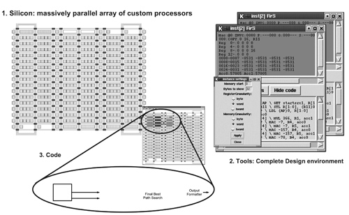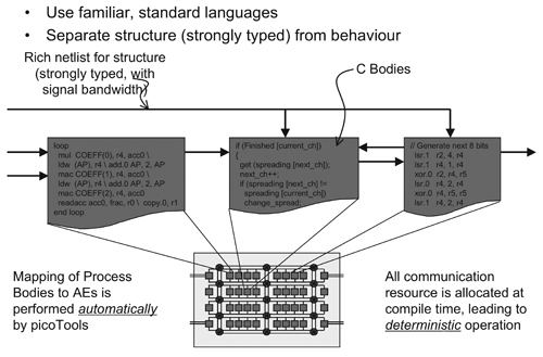 以picoChip的picoArray晶片為例,其含有數百個異質化的處理器,能針對訊號處理作業進行優化設計(圖1、圖2)。透過一對一的模式,其可將每個工作指派給各個處理器,處理器本身以標準C或組譯語言作為開發工具。因此,不僅效能會隨著處理器數量呈現線性成長,更重要的是,它讓一般工程師能快速且輕易地開發程式(圖3)。