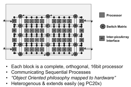 picoArray的各種平行架構,可從許多層面解決功耗問題。第一,其於執行特定功能時運用了許多更省電的方法,尤其是當軟體設計時,刻意分成多個功能模塊。微調的多重核心架構,能借重各種現代功耗管理技術,類似時脈控制閘與區域化的關閉電源,讓停止運作的元件,都能暫時關閉。這使得系統能以更聰明的方式運作,解決現代製程中主動功耗與靜態漏電流的問題。