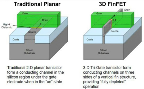 | 圖1 傳統平面式(左)與鰭式場效電晶體(右) 圖片來源:IDF, Intel Development Forum(2011)