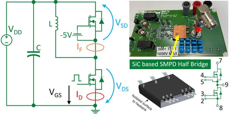 在基於SiC MOSFET的SMPD和標準分離式封裝之間進行動態測量,可以量化SMPD所提供的優勢。如圖2所示,測量原理是基於標準的雙脈衝測試裝置,並使用動態特性分析平台進行測試。在MOSFET開關參數方面進行元件比較,如開關時間TSW和開關能量ESW,以及二極體開關參數,如反向恢復時間trr、最大反向電流Irm和反向恢復能量Err。如圖3所示,將一個1200V的SiC SMPD元件與具有相近導通電阻RDS(on),在閘極至源極工作電壓(VGS)方面採用相近技術的標準分離式封裝元件進行比較。