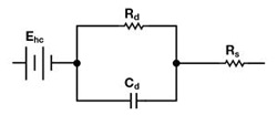 圖1顯示了電極的等效電路。Rd和Cd表示與電極至皮膚的接觸及接觸處的極化情況相關的阻抗,Rs是與電極材料類型相關的串聯阻抗,而Ehc是半電池電位。