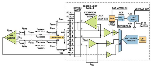 阻抗測量需要電壓/電流源和電流表/電壓表,因此數位類比轉換器(DAC)和ADC都是常用的元件。精密參考電壓源和電壓/電流控制迴路都非常重要,而且通常須要使用微控制器(MCU)來處理和獲取阻抗的實部和虛部。