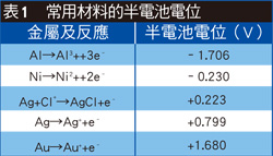 半電池電位因電極材料而異,如表1所示。當無電流通過電極時,可觀察到半電池電位,存在直流電流時,測得的電壓會升高,這種過壓狀況會阻止電流流動,使電極極化,並降低其性能,特別是在運動情況下。對於多數生物醫學測量,非極化(濕)電極比極化(乾)電極要好,但可攜式設備和消費類設備通常都使用乾電池,因為乾電池成本低且可重複使用。