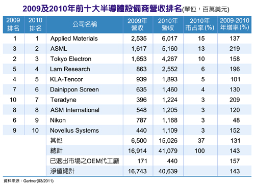 應用材料(Applied Materials)在此次調查中仍維持龍頭地位,但由於未能直接受惠於2010年廠商大舉投入微影技術相關資本支出的風潮,市占率未見提升。反觀微影設備大廠ASML,由於在雙重曝光用浸潤式微影(Immersion Lithography)領域表現強勁,不僅營收較2009年暴增219%,讓排名由第三名晉升至第二名,市占率亦增長至13%,成為2010年前十大半導體設備廠中成長最快的公司。此外,自動化設備商泰瑞達年營收成長率也高達209%,表現亦相當搶眼。