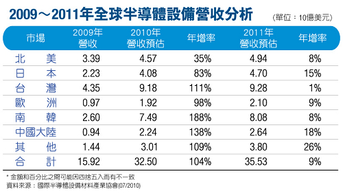 報告指出,2009年因為全球景氣不佳,讓整體設備市場慘跌46%。但2010年設備市場將從谷底翻揚,翻倍成長104%,2011年成長將趨於緩合,年增率僅約9%。從區域市場來看,台灣2010年採購金額預估將增長111%,達到91億8,000萬美元,蟬連最大半導體設備市場,而南韓則緊追在後,北美居第三。