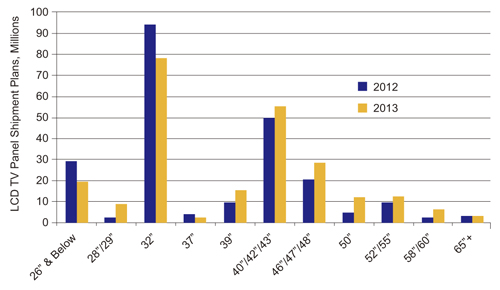 | 圖1 2012∼2013年電視面板廠按尺寸出貨計畫比較 資料來源:NPD DisplaySearch(01/2013) |