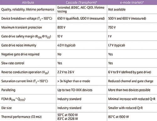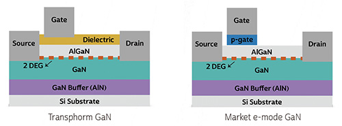 從技術架構來看,Transphorm 採用的是創新的Cascade架構(圖1),Yim解釋,該公司的架構是在氮化鋁鎵(AlGaN)層上又加了一個介電質(Dielectric);另一種e-mode架構則是在氮化鋁鎵層上加上了P-Gate,最主要的差異(圖2)在於e-Mode GaN需要配合驅動晶片,而該公司的Cascade架構則不需要驅動晶片,可以直接驅動,驅動電流也更大。