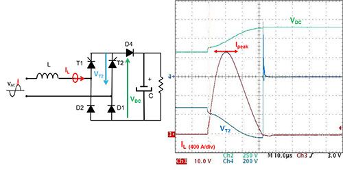 在90O相角施加4KV正浪湧電壓,如圖2的示意圖所示(無PFC),是為了模擬最惡劣的應用環境;因此,為L選用一個2µH電感,而C是一個100µF電容。可控矽整流管是兩個50A的TN5050H-12WY,而D1、D2和D4二極體(PFC旁通二極體)則是STBR6012-Y整流管。