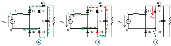 在90O相角時,T1和D1導通,浪湧提高電流,並致使D4導通。因為PFC電感保持電壓,浪湧電流旁通二極體D4,避免燒毀PFC續流二極體(D3)。
