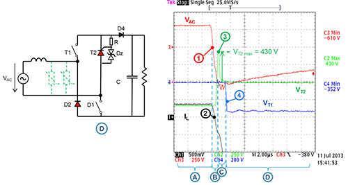 在此測試中選用一個1,5KE400CA的Transil二極體。這個二極體可將鉗位元電壓的峰值限制到一個極低的水準(430V)。在C階段,D1上的負電壓絕對值是VT2與VDC之和。如果輸出直流電壓是325V,則D1上的負電壓最大值是755V(在STBR6012-Y的容許範圍內)。電壓值更高的Transil或低電能Transil(1,5KE400CA是一個1500W Transil)將會引起更高的鉗位元電壓,導致更高的電壓施加到D1上。在T2的閘極與陰極之間連接的電阻器用於分流Dz Transil二極體輸出的電流,避免dV/dt引起的雜散觸發。