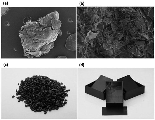 | 圖2 石墨烯濃縮母粒(a)、(b)電子顯微鏡圖;(c)石墨烯/尼龍66塑粒、(d)尼龍射出成品。 |