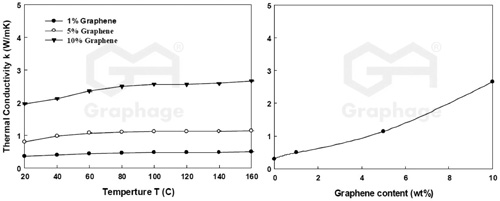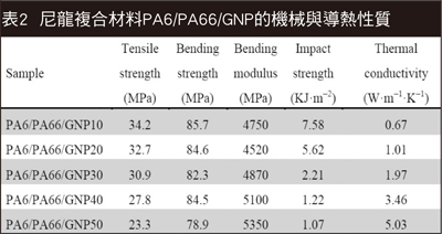 二維結構的石墨烯具高長徑比、優良導電與導熱性質,以及高機械強度,使得塑膠中石墨烯粉體的添加,可望大幅增加塑膠導熱或導電性。石墨烯相較其他一般的導熱填充料,最大優勢在於僅需少量的石墨烯添加,即可超越其他填充料高添加量的效果,不僅性能更加提升,也避免過多添加劑對塑膠在機械強度造成的嚴重負面影響。2014年暨南大學Xu等人在Applied Mechanics and Materials的研究文獻中提出,使用導熱型石墨烯微片粉末KNG-180(粉體直徑40μm,厚度小於100nm),以熔融混煉法使用雙螺桿押出機在螺桿速度120rpm條件下,製備添加50wt% KNG-180的尼龍導熱複合材料,結果如表2所示,其導熱係數相較於純尼龍可提升約15倍,達到5.03W/mK。