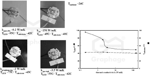 以尼龍46/石墨烯導熱複合材料應用於LED散熱鰭片為例,如圖3所示,石墨烯添加量僅10wt%即可達導熱係數約2.2W/mK,若進一步使用石墨烯濃縮母粒進料,可大幅增進石墨烯分散性,在5wt%的石墨烯添加量達導熱係數2W/mK。將上述所得尼龍46/石墨烯導熱複合材料進一步射出成型50mm直徑、厚度2mm的圓形基材,以1瓦LED燈做為熱源測試基材散熱效果。結果如圖4所示,具2W/mK熱傳導係數的尼龍46/石墨烯複合材料,與純尼龍基材相比可將LED燈溫度由95℃降至75℃,已經接近鋁質散熱器的效果。