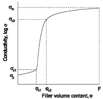 導電填充劑與塑膠複合化的方法在導電劑填充量低時,塑膠導電率隨填充量緩慢增加,而當填充劑達一定濃度時,導電率開始呈急遽上升達數個量級的增長,此時的濃度稱為滲透濃度(percolation threshold, φc1)當超過此臨界值後,導電率隨填充量的增長又會趨於緩慢,如圖5所示。