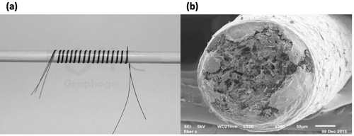 | 圖7 (a)石墨烯複合纖維;(b)複合纖維微觀圖 |