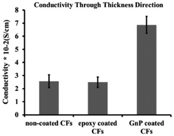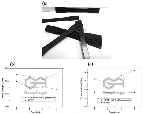 另一方面,Qin等人在2015年出版的Composites Part B:Engineering研究報告中指出,添加石墨烯後也會提升材料整體的導電度和機械強度,在碳纖維/環氧樹脂複合材料的製造過程中,使碳纖維預浸至溶液中,並且將石墨烯懸浮液以液相–液相混合均勻,使石墨烯可以充分附著。所得產物再進行後續程序加工測試。