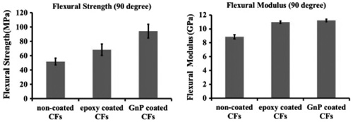 | 圖9 複合材料添加石墨烯後的彎曲性能。左為彎曲強度,右為撓曲模量。 |