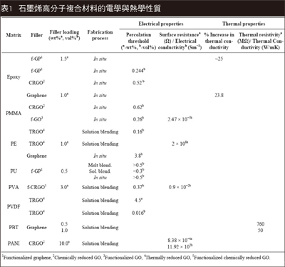 Galpaya等人於2012年刊載的SciRP期刊中,概述近年來將石墨烯應用於高分子複合材料中,對複合材料所提升性質的效益。表1即列出於各式基體高分子中,添加由不同還原法所製得石墨烯或具官能基修飾石墨烯做填充劑對複合材料電學或熱學性質的提升,數據顯示石墨烯於高分子複合材料的應用,僅需少量添加即可達滲透濃度,大幅提升複合材料導電性。