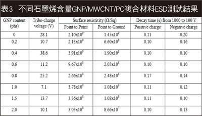 Poosala等人於2013年在IJIRSET期刊發表其研究論文。該研究以聚碳酸酯為母體塑料,添加0.5wt%多壁奈米碳管與0~2phr的石墨烯做為填充劑,進行熔融混煉並射出測試複合材料ESD。測試結果如表3所示,僅添加奈米碳管的複合材料無法符合美國電子工業聯合會(Electronic Industries Alliance, EIA)標準,在加入微量石墨烯後的複合材料大部分可符合標準,但與石墨烯添加量卻無一定趨勢,文獻中歸因於石墨烯於聚碳酸酯中不良的分散所致。由此可見,石墨烯於複合材料中的親合與分散性,對石墨烯提升複合材料性質影響非常重要,亦是石墨烯有效應用在複合材料中相當重要的研究課題。