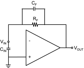 正如本文一開始時所述,運算放大器是電壓放大器而不是電流放大器,圖4中的電流源擁有極大的電阻,因此不會對回饋係數有任何影響。至於該兩個輸入電容器則可透過CIN=CJ+CCM的設定組合在一起。因此,當電源流不會帶來影響時,圖4中的電路僅是一個微分器電路(Differentiator Circuit),當中的輸入電容通往電路(CIN)的接地。即使轉阻放大器是把電流轉換成電壓的轉換器,但回饋係數仍是基於電壓放大器的配置,也就是基於微分器電路。