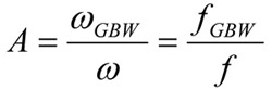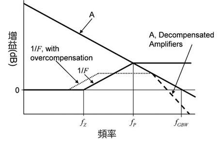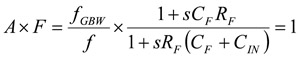 在fZ加入零點會令1/F之斜率出現由0dB至+20dB的變化。為了達到穩定,1/F的斜率必須返回0dB,而方法就是加入CF以產生出一個極點。此外,圖6也代表一個過補償的例子,當中的CF值大於其最佳值。通過加大CF,1/F的極點和零點將可出現在較低的頻率處。這樣,CIN對零點值的影響便很小,因此極點和零點的頻率便會同時下降,並且隨著CF在過補償時的增加而逐漸接近。當使用非補償運算放大器時,便可能須使用過補償,此時1/F和A的相交點會出現在接近A的第二個極點。A的算式其實是一個增益和頻寬的乘積: