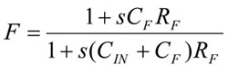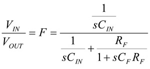 轉阻放大器的回饋係數基本上會與微分器電路的回饋係數相同,唯一的不同是微分器電路的CIN被加上運算放大器的反向輸入上,但在轉阻放大器中,CIN只是光電二極管的電容值和運算放大器的輸入電容值之總和,且須注意在低頻時F=1。