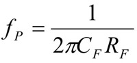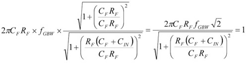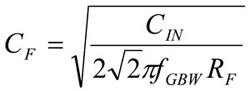 在算式中,fGBW是一個頻率,在該處增益為一的穩定運算放大器的開放迴路增益等於0dB(1V/V)。對於沒有補償的零組件,假如-20dB的斜率被擴展到0dB的線上,在這點上的頻率便等於fGBW的數值。使用算式A×F=1,可解出CF為: