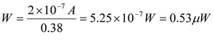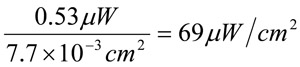 若光源的所有能量均集中在光電二極管的活動區,只須進行上述的計算便足夠,本例中光電二極管的活動區面積為0.77平方毫米,且呈圓形狀。光纖電纜的切面面積比光電二極管大,且其光功率一般都以W/cm2作為量度單位,若現在把光電二極管的活動區面積以平方釐米表示,結果便為7.7×10-3平方公分。對於相同的0.2微安培輸出電流光源,但以W/cm2作量度單位的話,所需的功率便為:
