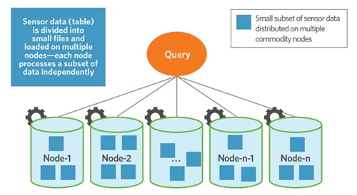 此架構亦能對須處理大量資料集的查詢進行分割,讓部分查詢可在多個節點上平行執行(表1)。因此即使資料容量擴大,也可大幅縮短查詢的處理時間。假設查詢述詞使用特定的時間範圍和工具集,例如用資料庫中的兩個欄,譬如時間、工具進行篩選。再假設,所需資料來自工具集所儲存的一百個感測器的其中十個。在Hadoop架構下,查詢引擎將掃描兩個欄中經過壓縮和連續的值,以篩選資料並從十個感測器樣本擷取輸入。引擎將不會處理工具所儲存的另外90%的感測器資料,因此可大幅減少查詢引擎所須掃描的資料量。