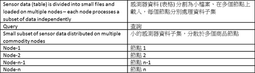 | 表1 Hadoop 叢集中分散於多個節點的感測器資料,查詢處理亦在多個節點上散布平行執行。 |