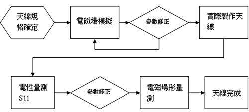 一般天線的設計步驟如圖4所示。天線的設計從應用需求、初步規格及形狀尺寸的確定,進入電磁場模擬軟體的反覆模擬和修正,然後再依據模擬結果去實際製作天線,經過網路分析儀測試其阻抗和返回損失後,再送到無反射實驗室量測其電磁場形和增益等相關資料,最後才完成符合規格需求的天線,這樣的設計所需花費的時程約150天,如果再加上電磁場模擬軟體(約新台幣500萬元)和網路分析儀等相關儀器(約新台幣300萬元)的投資,其基本的成本費用將超過新台幣1,000萬元以上,更別說加上高頻無反射實驗室的設置和購買相關儀器設備,將使其投資成本呈倍數增加。