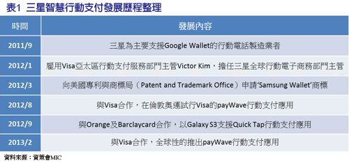 三星早於2011年即開始支援行動支付應用,當時雖為支援Google Wallet的主要行動裝置製造商,但整個生態環境仍由Google主導建構,三星僅處於被動配合角色,隨著三星於行動裝置的市場地位快速爬升,其已更加積極布局,以爭取行動支付應用主導地位。